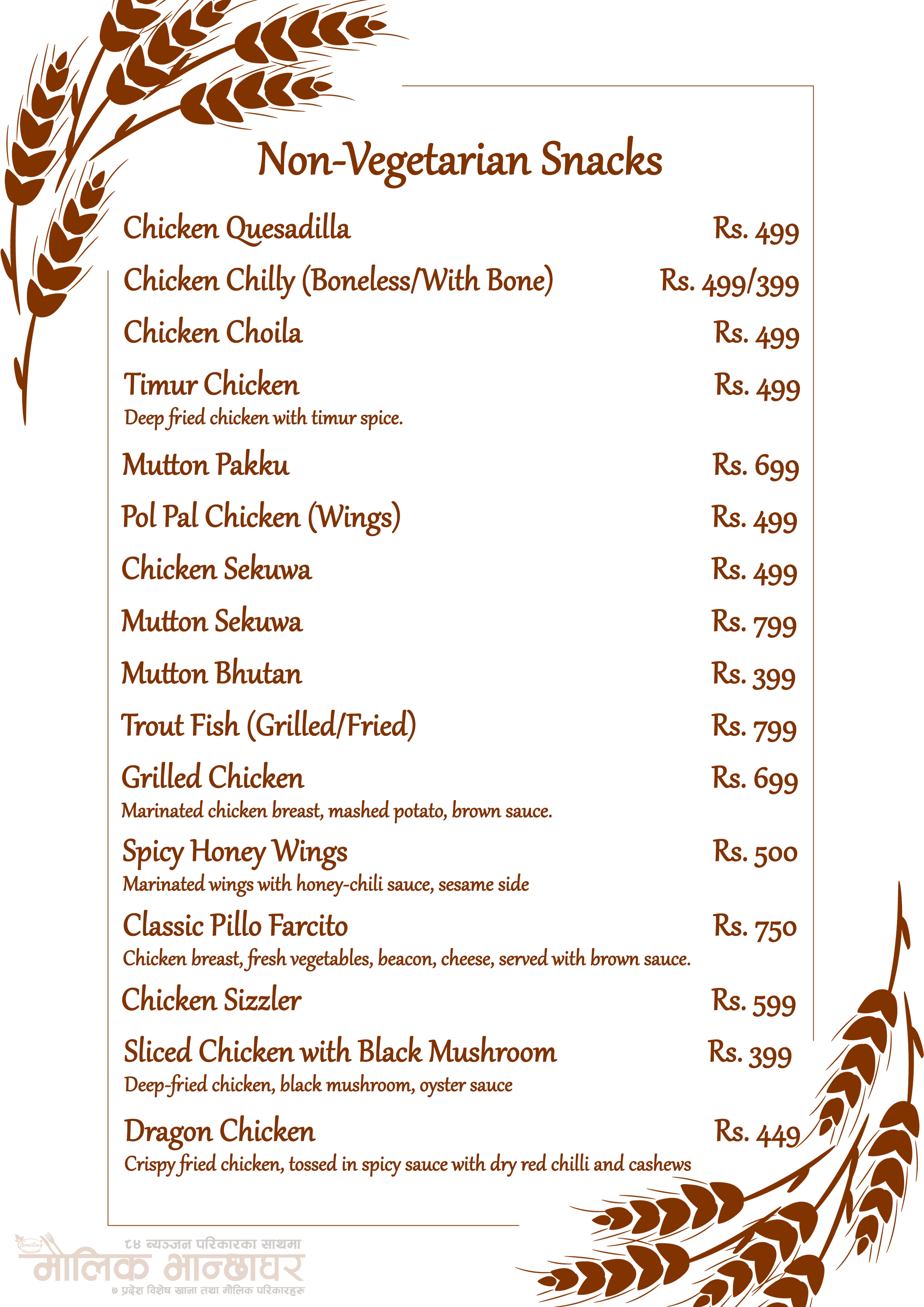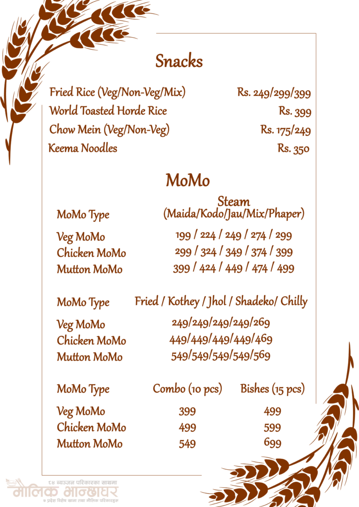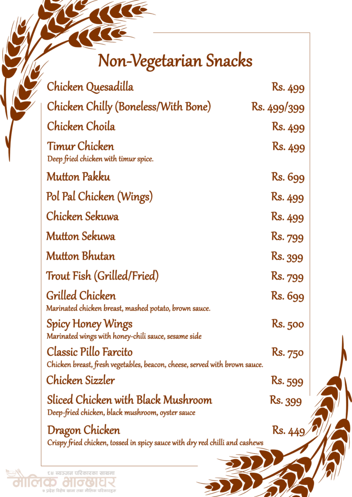 Delicious fusion of Nepalese Maulik flavors of all 7 States and continental cuisine, offering rich spices, grilled meats, and hearty meals.